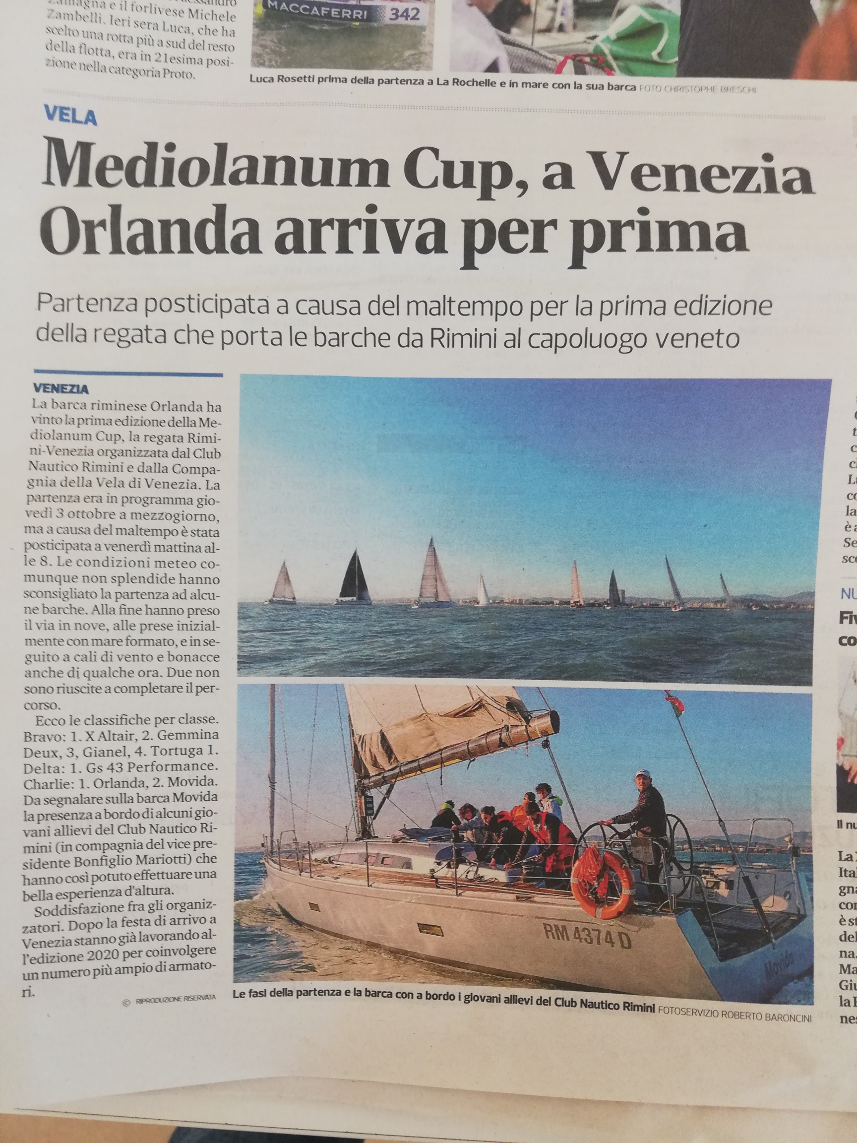 Seconda assoluta Movida, lo Sly47 Del Pardo, di Bonfiglio Mariotti, a bordo con 4 giovanissimi della squadra agonistica Laser del Club Nautico Rimini. Skipper Luca Del Zozzo e Gianfranco Passafiume che si sono alternati al timone insieme ai giovanissimi atleti. Per loro per una esperienza unica a quella giovane età.